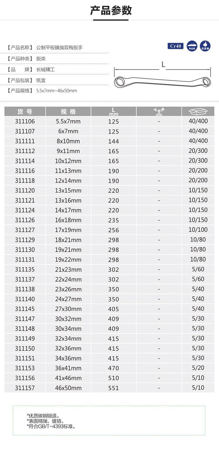 - 商品名称:长城精工 公制平板镜抛双梅扳手 311147 单位:把
