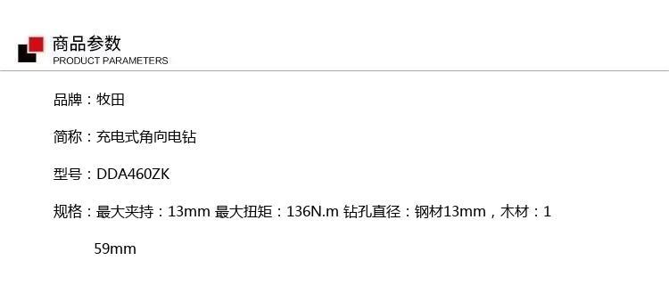 - 商品名称:牧田 DDA460ZK 充电式角向电钻 最大夹持:13mm 最大扭矩:136N.m 钻孔直径:钢材13mm,木材:159mm 36V 裸机 单位:台