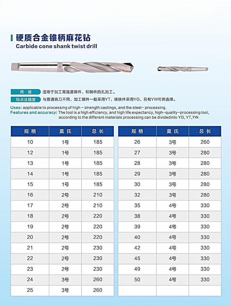 - 商品名称:沐鑫泰 莫氏锥柄麻花钻 Φ20 镶硬质合金 外冷 硬质合金 整体式 220mm 19mm 莫氏锥柄#2 铸铁;钢 国产 锥柄 物理涂层 锥柄麻花钻-硬质合金-φ19mm 118° 1支/支 支