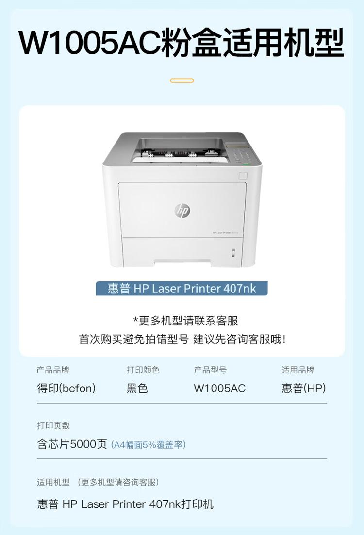 - 商品名称:得印 粉盒 W1005AC 5000页 惠普;HP;LASER;PRINTER;407NK打印机 黑色 1支/支 支