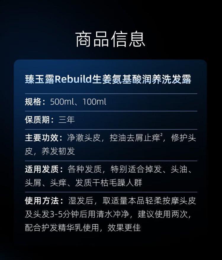 - 商品名称:Rebuild臻玉露 100ml 润养洗发露 生姜氨基酸 单位:瓶