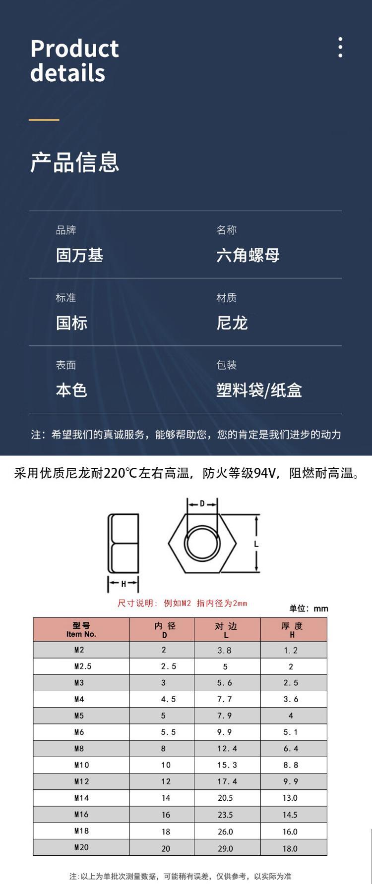 - 商品名称:固万基 尼龙六角螺母 M14 M2M3M4M5M6M8M10M12M16M18M20 国标 10个 白色 单位:包