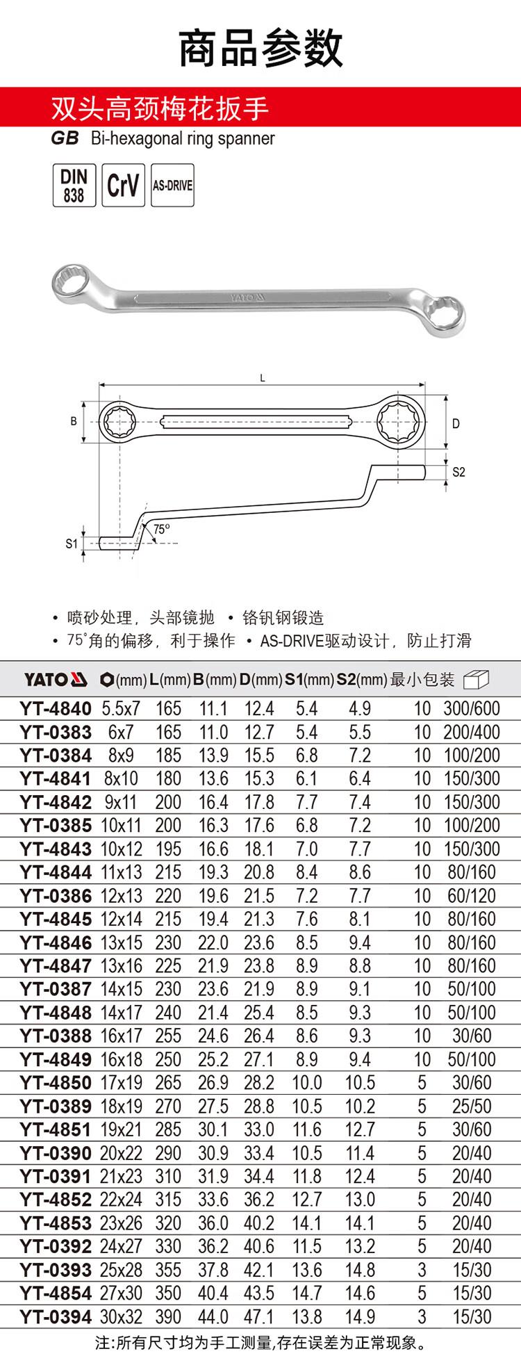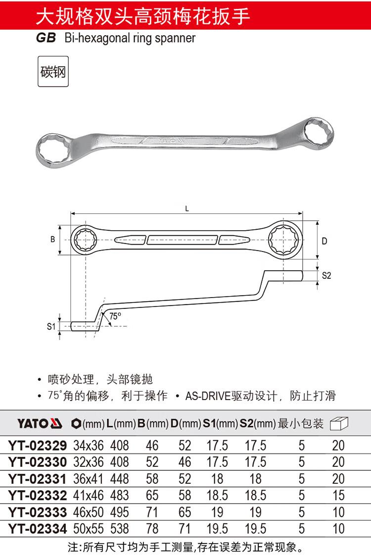 - 商品名称:易尔拓/YATO 双头梅花扳手 YT-0389 公制 合金钢 18×19 270mm 合金钢 双梅花扳手 18×19 1个/个 个
