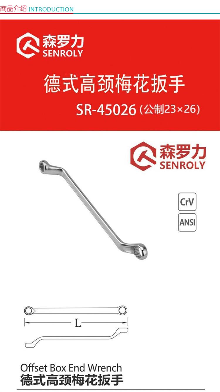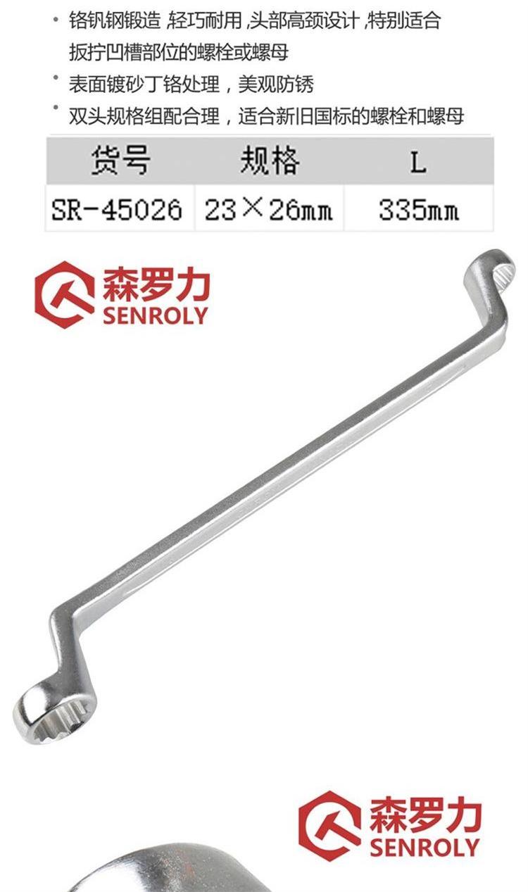 - 商品名称:森罗力 高颈双头梅花扳手 SR-45026 公制 铬钒钢 23×26mm 335mm 铬钒钢 高颈梅花扳手 23×26 1个/个 个