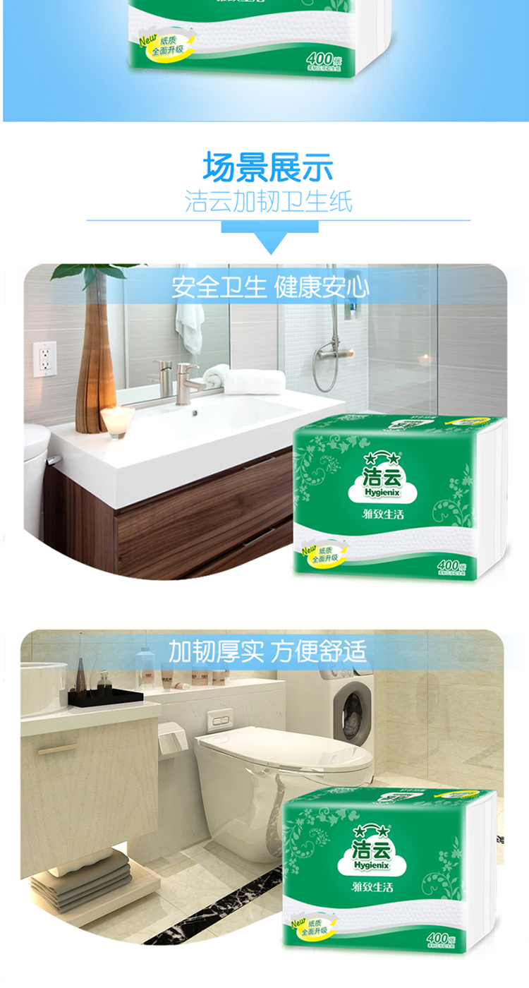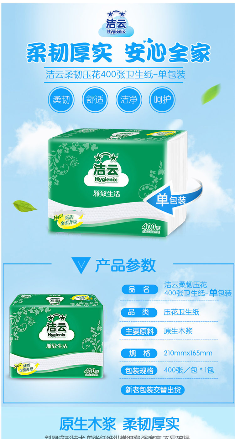 - 商品名称:洁云 10370001 平板卫生纸柔韧压花 400张 (42包/箱) 单位:包