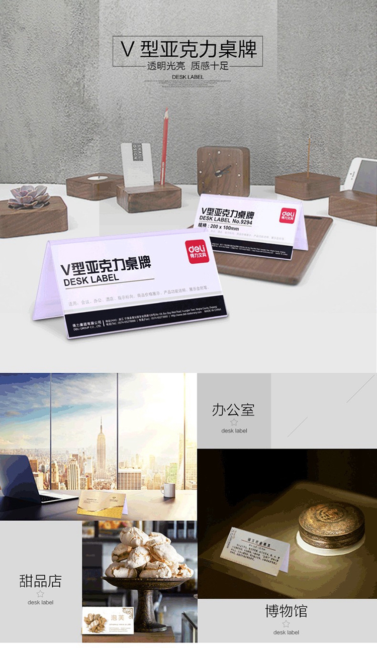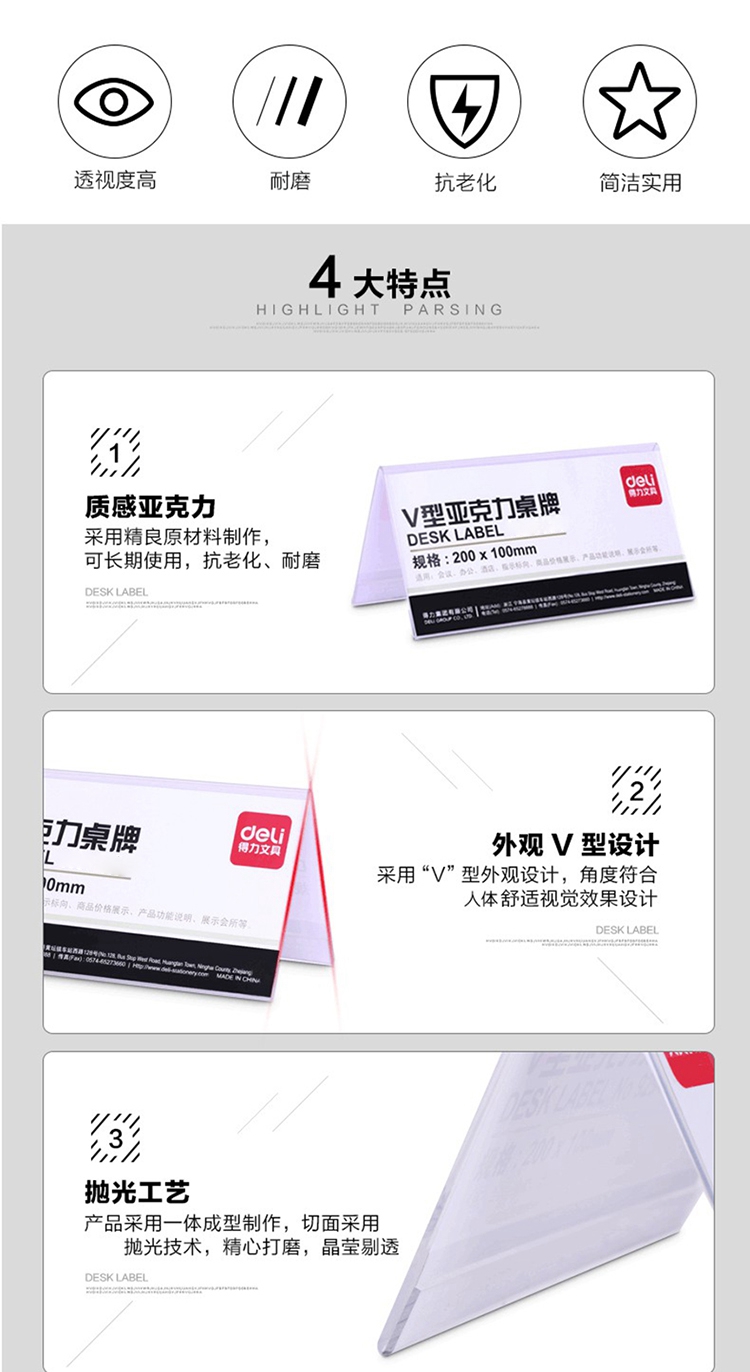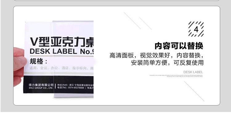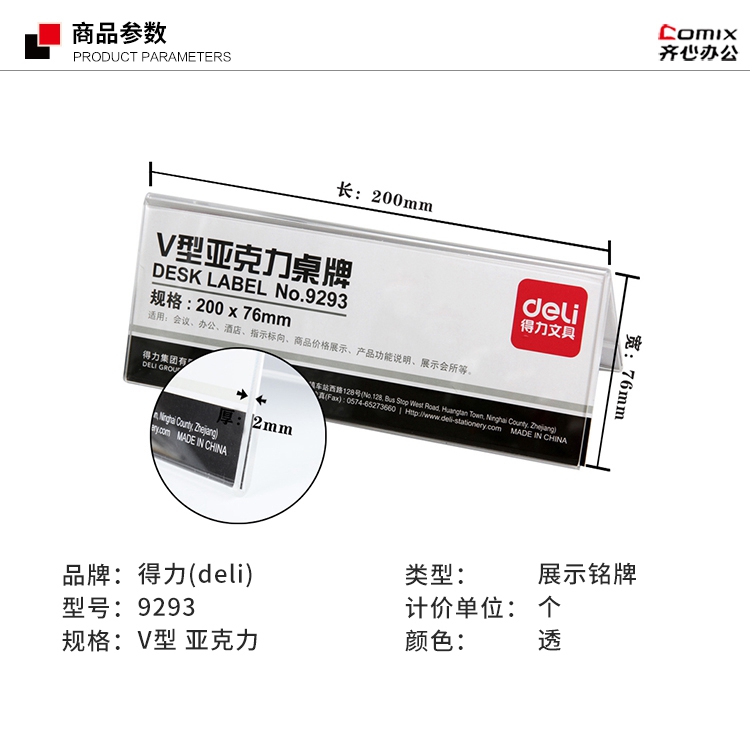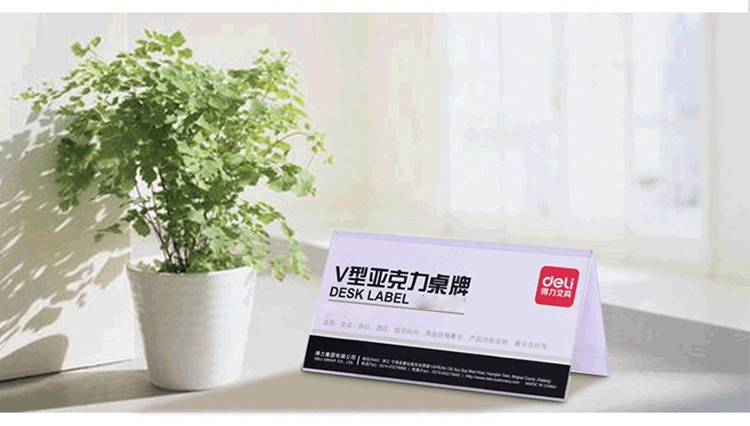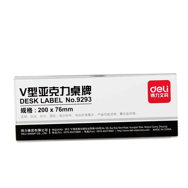 - 商品名称:得力 9293 V型亚克力桌牌 200mm*76mm 单位:个 本色