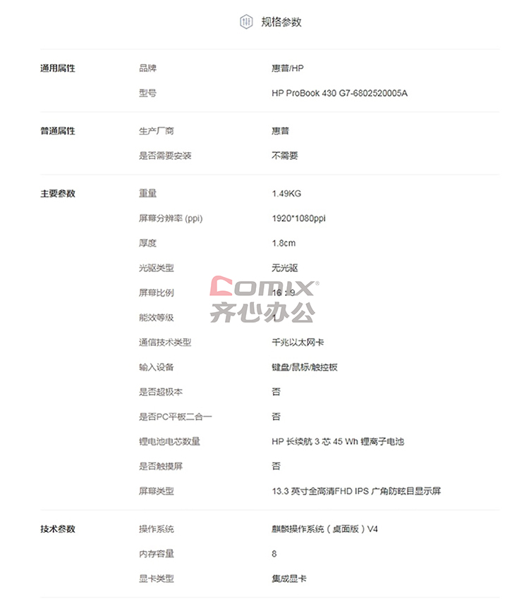 - 商品名称:惠普 ProBook 430 G7-6701600005A 笔记本电脑 银色/i7-10510U(1.8 GHz/8 MB/四核)/13.3'寸屏/8G DDR4 2666Mhz内存/256G M2 PCIe NVMe SSD固态硬盘/集成显卡/无光驱/麒麟操作系统(桌面版)V4/包鼠/一年保修 单位:台